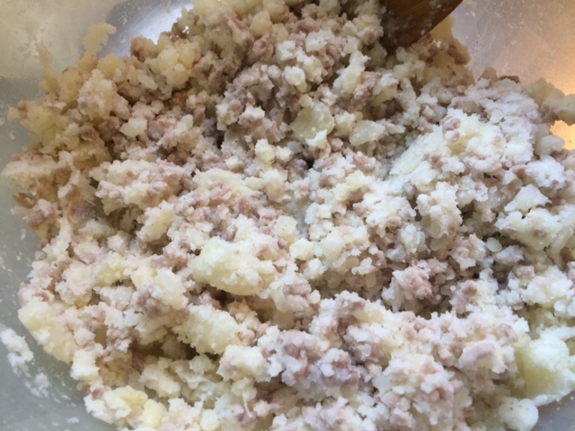 ゆでてつぶしたジャガイモに 水気を切ったひき肉を足して