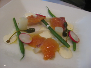 これで印象的だったのが、このお皿はアスパラの下のほうだけだったけれど横のマダムのプレート(私たちより高いコース)には先のほうが乗ってた。