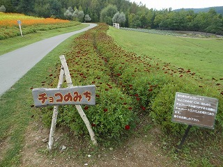 お花の中心を嗅ぐとほのかなチョコレートの香りのする6品種のチョコレートコスモスの花畑「チョコのみち」も見頃です。