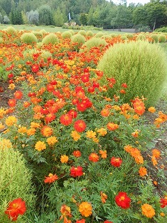 まんまる「コキア」とキバナコスモスの競演花壇も綺麗です。