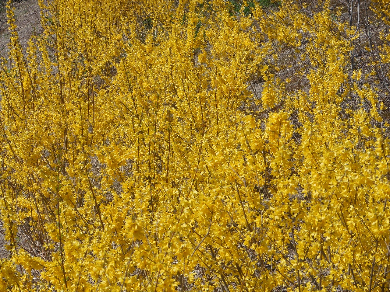 カントリーガーデン 花のまきばのスキーリフトの斜面一面にレンギョウの花が咲いています。