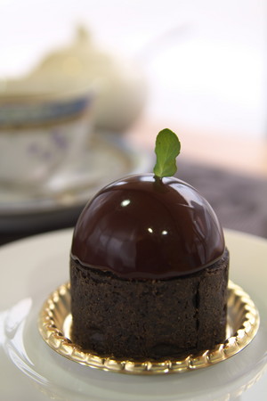 上のドーム状はムース。下の土台はブラックココア入のサブレ生地を