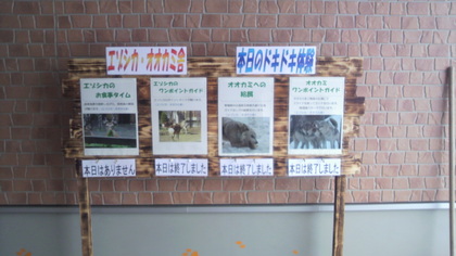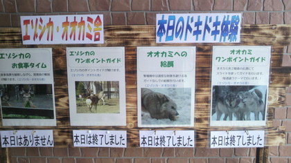 「エゾシカ・オオカミ舎今日のドキドキ体験」案内板