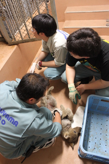 5頭に均等に餌を与えながらの解説は厳しい物があると思います。