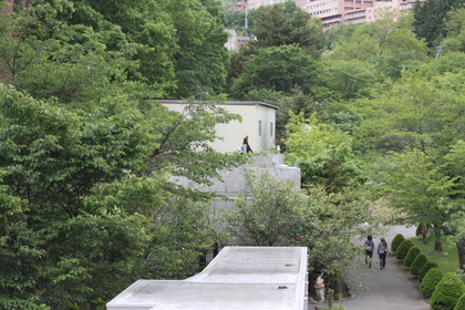 違う目線と言えばオオカミ舎からエゾヒグマ館を見ると同じ目線に“とわ”がいました。
